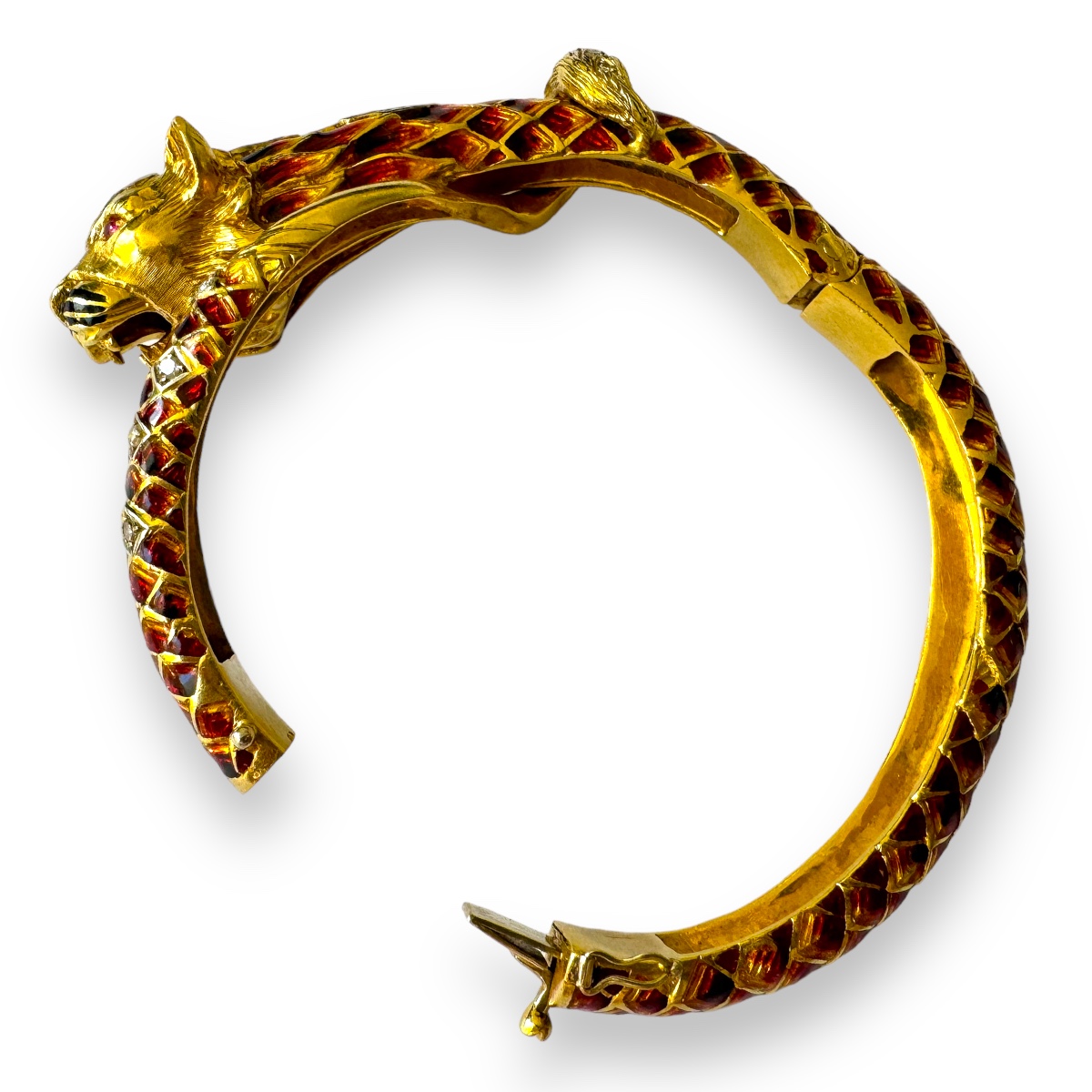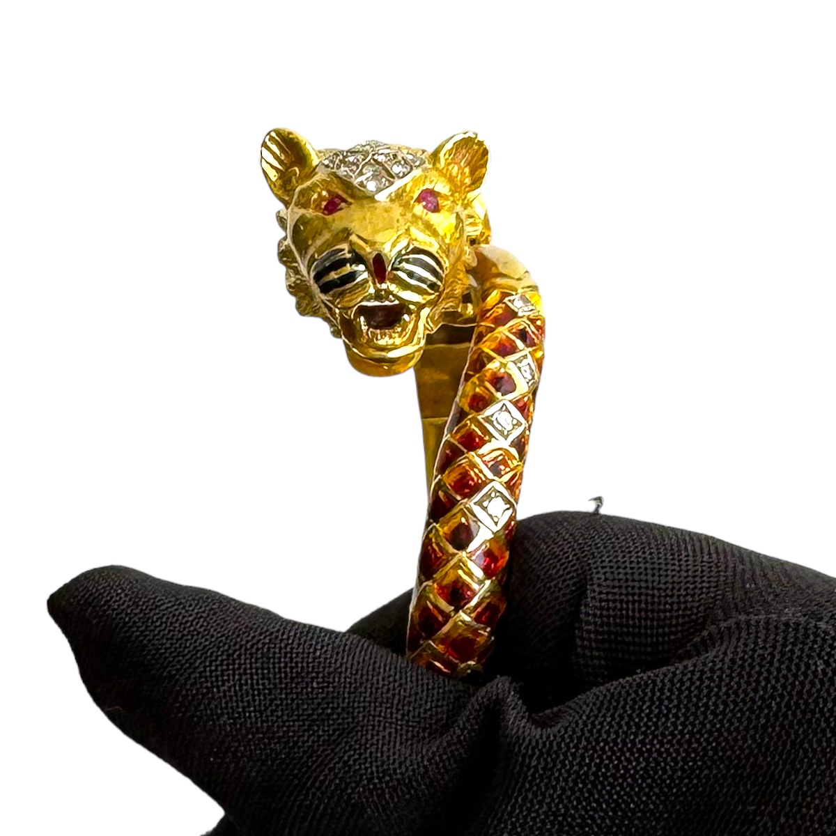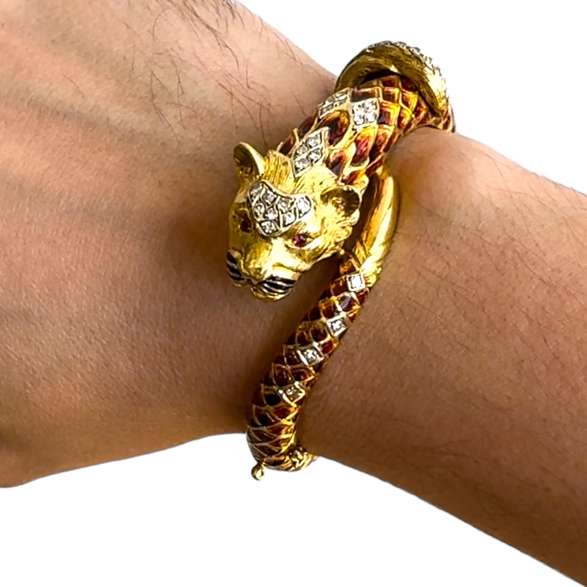 Pulseira rara vintage italiana Tiger esmalte, diamante e rubi 18k da década de 1950. Esta linda pulseira Tiger é magistralmente feita à mão em ouro amarelo 18k, com detalhes intrincados em esmalte em várias cores. A pulseira apresenta uma cabeça de tigre cravejada de diamantes com olhos de rubi e viseiras esmaltadas. O corpo é totalmente esmaltado com tons vibrantes de laranja, amarelo e preto, com pescoço e cauda cravejados de diamantes redondos.