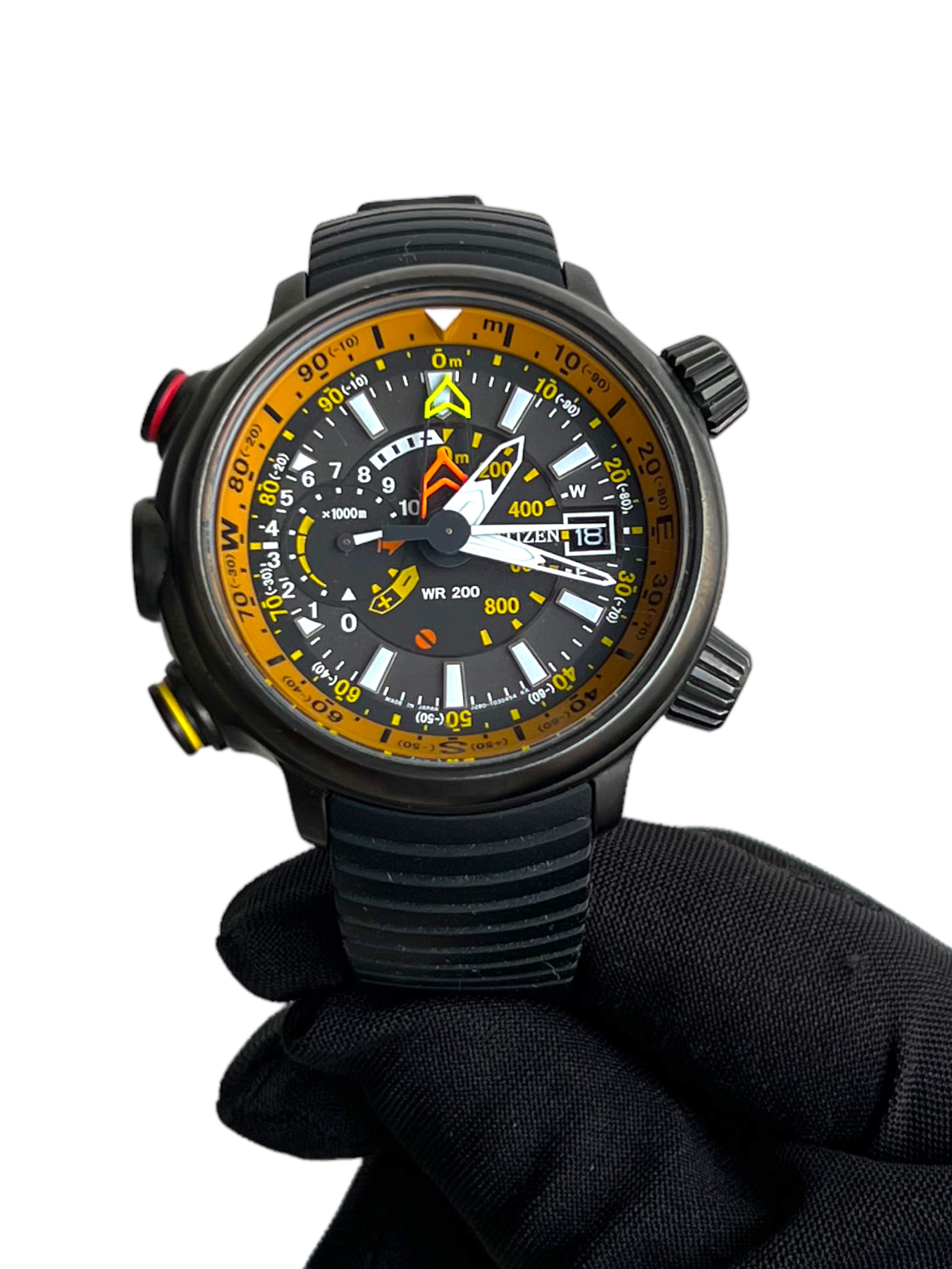 Funções: Altímetro de -300 a 10.000 metros, com dois ponteiros indicadores: o principal e outro localizado no submostrador 9 horas. Bússola eletrónica. Indicador de reserva de carga. Calendário. WR 20 bar.